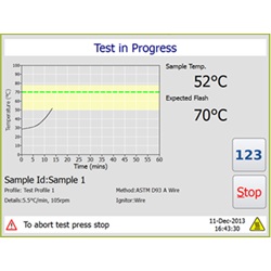 予期引火点が既知の場合は標準モード、そうでない場合はサーチモードを選択して、最大400℃までの引火点を自動で測定できます。測定が完了すると、PM-93はLCD画面に結果をグラフで表示します。測定結果は内蔵メモリに保存したり、Eメールで送信したり、USBメモリにエクスポートしたり、QRコードで転送したりすることも可能です。